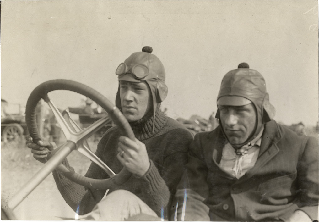 Close-up view of driver W.R. Burns and passenger in racecar during the 1908 Grand Prize races in Savannah, Georgia. Stamped on back: "Spooner & Wells, Inc., photographers, telephones 3472-3473 Columbus, 1931 Broadway, New York." Handwritten on back: "W.R. Burns. Races and racing--Grand Prize races, 1908."