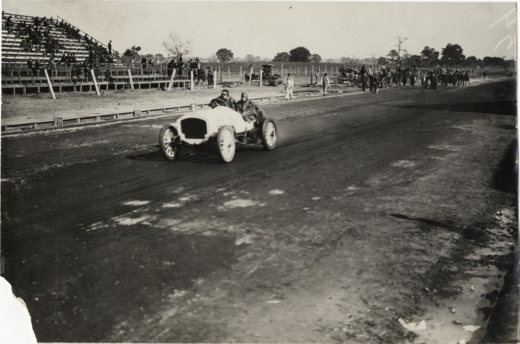 View of driver and passenger racing car on course during the 1908 Grand Prize races in Savannah, Georgia. Grandstand in background. Stamped on back: "Spooner & Wells, Inc., photographers, telephones 3472-3473 Columbus, 1931 Broadway, New York." Handwritten on back: "Races and racing--Grand Prize races, 1908."
