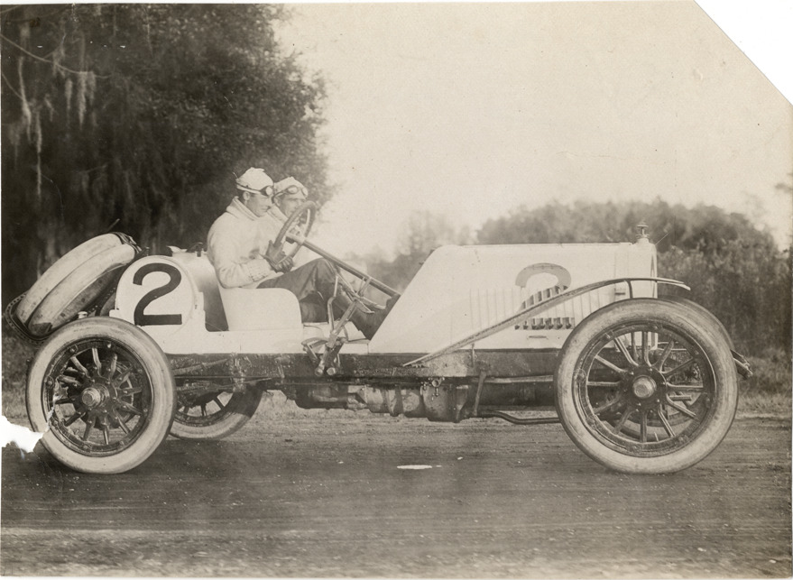 View of driver and passenger posing in car no. 2 during the 1908 Grand Prize races in Savannah, Georgia. Stamped on back: "Spooner & Wells, Inc., photographers, telephones 3472-3473 Columbus, 1931 Broadway, New York." Handwritten on back: "Races and racing--Grand Prize races, 1908."