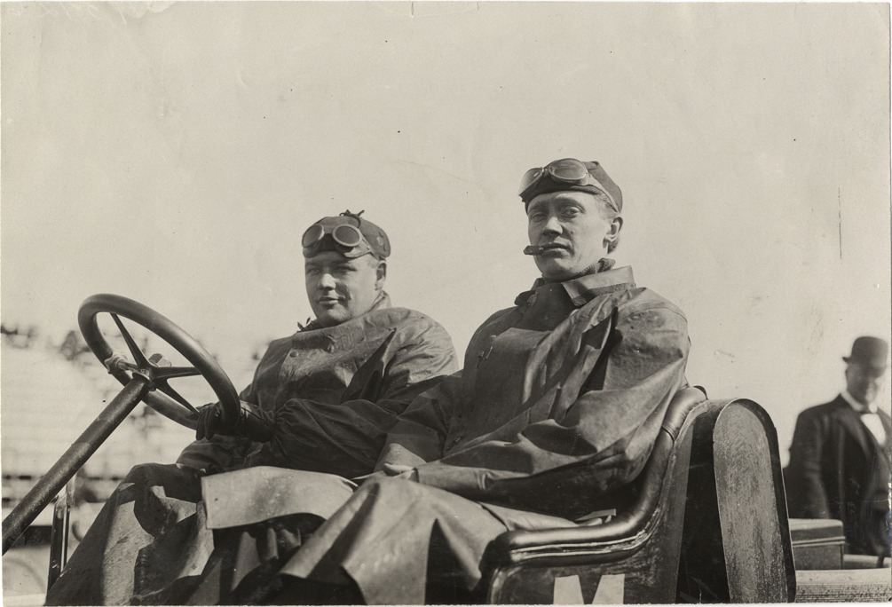 Close-up view of William Hilliard and passenger in Lancia racecar during the 1908 Grand Prize races in Savannah, Georgia. Stamped on back: "Spooner & Wells, Inc., photographers, telephones 3472-3473 Columbus, 1931 Broadway, New York." Handwritten on back: "Hilliard, Lancia. Races and racing--Grand Prize races, 1908."