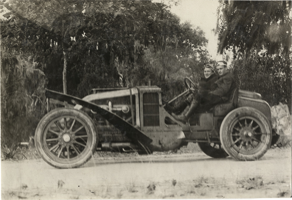 View of Louis Strang and passenger in Renault car during the 1908 Grand Prize races in Savannah, Georgia. Handwritten on back: "Renault, Strang. Races and racing--Grand Prize races, 1908."