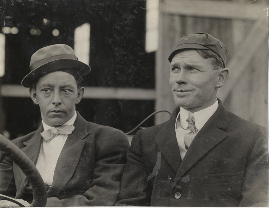 Close-up view of Earl Jeffers and passenger in Buick racecar during the 1908 Grand Prize races in Savannah, Georgia. Stamped on back: "Spooner & Wells, Inc., photographers, telephones 3472-3473 Columbus, 1931 Broadway, New York." Handwritten on back: "Races and racing--Grand Prize races, 1908."