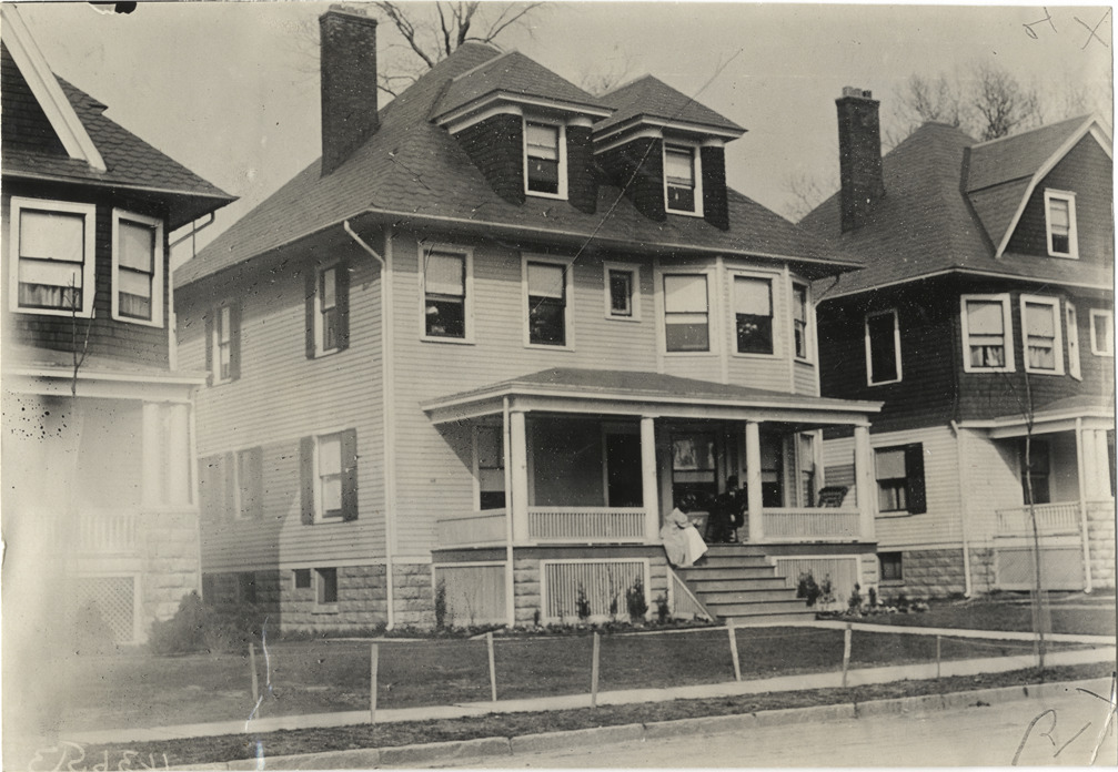 View of two-story wooden-frame house with covered entry porch and roof dormers during the 1908 Grand Prize races in Savannah, Georgia. Stamped on back: "Spooner & Wells, Inc., photographers, telephones 3472-3473 Columbus, 1931 Broadway, New York." Handwritten on back: "Races and racing--Grand Prize races, 1908."