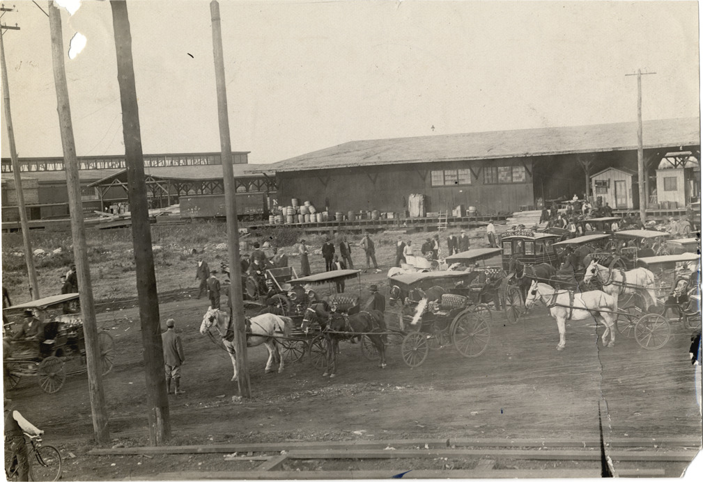 Horse-drawn carriages near railroad terminal, 1908 Grand Prize races
