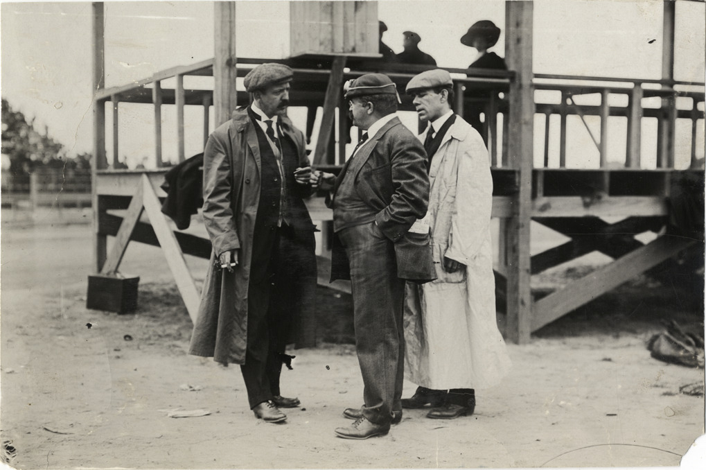 View of Robert Lee Morrell, Chairman of the Contest Committee, speaking with two racing officials during the 1908 Grand Prize races in Savannah, Georgia. Handwritten on back: "Races and racing--Grand Prize races, 1908."