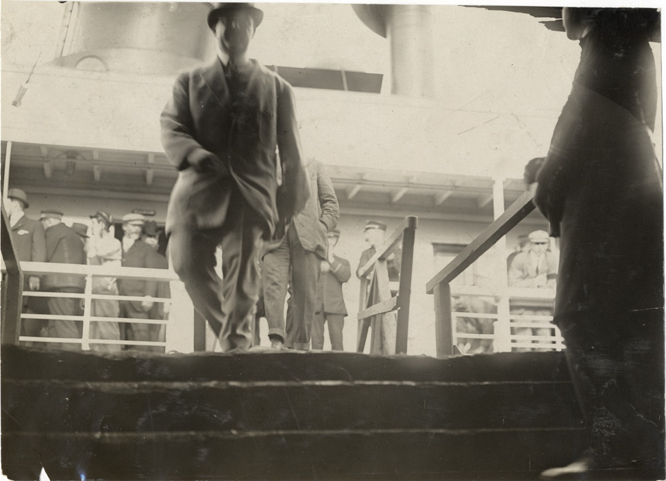 Members of Automobile Club of America walking on ship's gangway, 1908 Grand Prize races