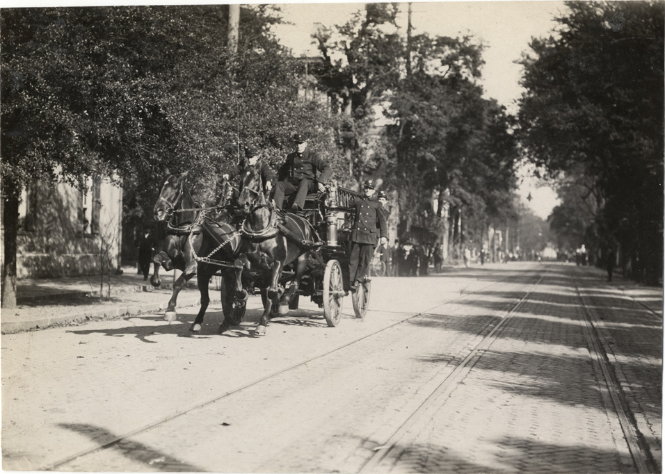 View of firemen from Savannah Fire Department on horse-drawn fire engine during the 1908 Grand Prize races in Savannah, Georgia. Stamped on back: "Spooner & Wells, Inc., photographers, telephones 3472-3473 Columbus, 1931 Broadway, New York." Handwritten on back: "Savannah Fire Dept. Races and racing--Grand Prize races, 1908."
