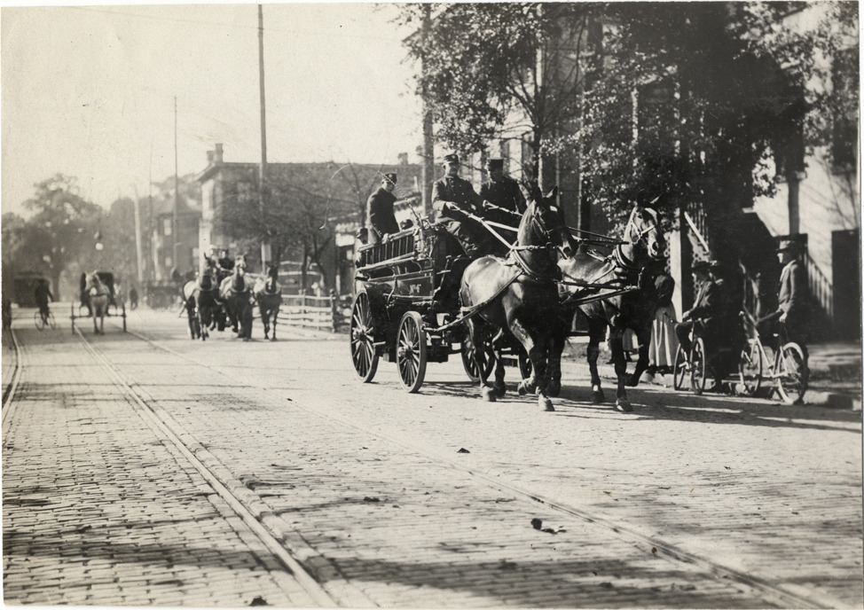 View of firemen from Savannah Fire Department on two horse-drawn fire engines during the 1908 Grand Prize races in Savannah, Georgia. Stamped on back: "Spooner & Wells, Inc., photographers, telephones 3472-3473 Columbus, 1931 Broadway, New York." Handwritten on back: "Savannah Fire Dept. Races and racing--Grand Prize races, 1908."