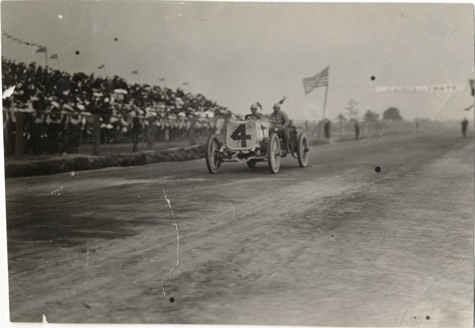 Driver and passenger in Lozier racecar, 1908 Grand Prize races
