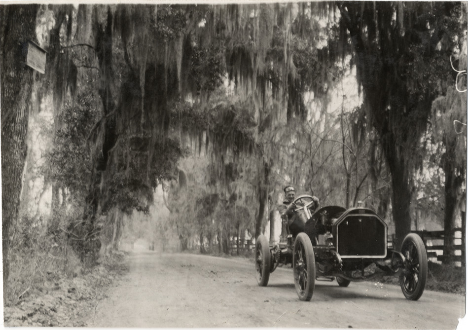 View of Frank Leland posing in Stearns car during the 1908 Grand Prize races in Savannah, Georgia. Handwritten on back: "Stearns, Frank Leyland [sic]. Races and racing--Grand Prize races, 1908."