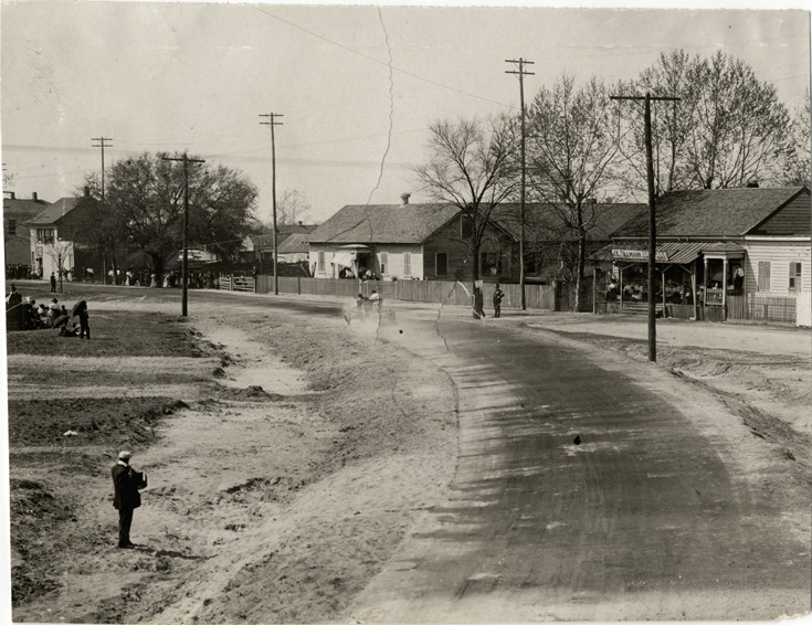 View of driver and passenger racing car on course during the 1908 Grand Prize races in Savannah, Georgia. Spectators on porch of J.E. Tillman grocery store on right; wooden-frame houses in background. Handwritten on back: "Races and racing--Grand Prize races, 1908."