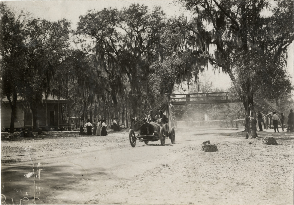 View of Herbert Lytle and passenger racing Apperson car no. 1 on course during the 1908 Grand Prize races in Savannah, Georgia. Pedestrian bridge in background. Handwritten on back: "Apperson, Lytle. Races and racing--Grand Prize races, 1908."