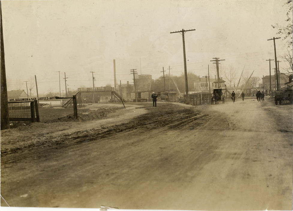 View of course during the 1908 Grand Prize races in Savannah, Georgia. Banner for Solomon & Son coffees on fence in foreground. Horse-drawn carriage, bicyclists, railroad cars and pedestrian bridge in background. Handwritten on back: "Races and racing--Grand Prize races, 1908."