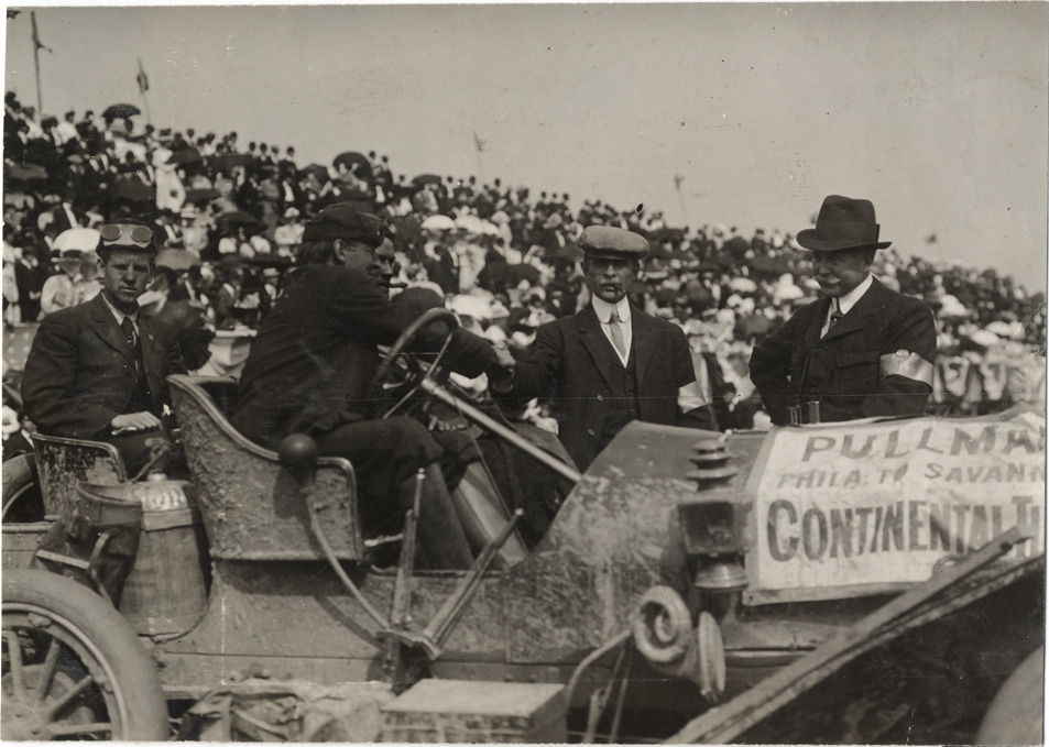 View of Savannah mayor George Tiedeman and racing official greeting P.F. Gillette and two unidentified men in Pullman car during the 1908 Grand Prize races in Savannah, Georgia. Car traveled from Philadelphia to Savannah. Banner on automobile hood reads: "Pullman, Phila. to Savann[ah], Continental ti[res]." Handwritten on back: "P.F. Gillette & party, Philly to Savannah race. Races and racing--Grand Prize races, 1908."