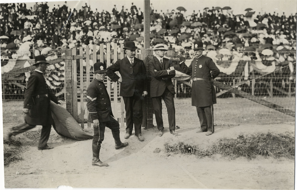 Favorite this☆ Policemen and officials, 1908 Grand Prize races Description: View of four police officers standing with two officials during the 1908 Grand Prize races in Savannah, Georgia. Spectators in grandstand in background. Handwritten on back: "Races and racing--Grand Prize races, 1908." Details Resource ID: na013387 Subject: Police--Georgia--Savannah Sports officials--Georgia--Savannah Automobile racing--Georgia--Savannah Photographic prints Date Issued: 1908 Format: 1 photographic print ; 4.25 x 6.5 in. Member of: National Automotive History Collection Lazarnick Collection Filing Location: Races and racing--Grand Prize Races, 1908 #34 Rights: Physical rights are retained by DPL. Copyright is retained in accordance with U.S. copyright laws.