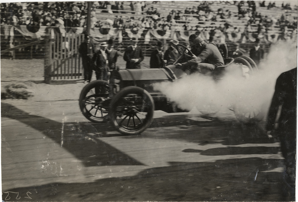 William McCulla and passenger in Apperson racecar at starting line, 1908 Grand Prize races