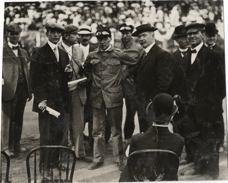 Mayor George Tiedeman, Louis Strang and officials, 1908 Grand Prize races