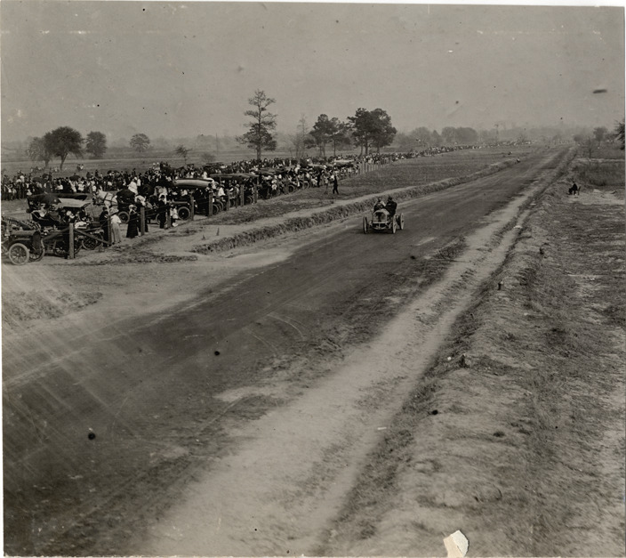 View of driver and passenger racing car past spectators on roadside during the 1908 Grand Prize races in Savannah, Georgia. Handwritten on back: "Races and racing--Grand Prize races, 1908."
