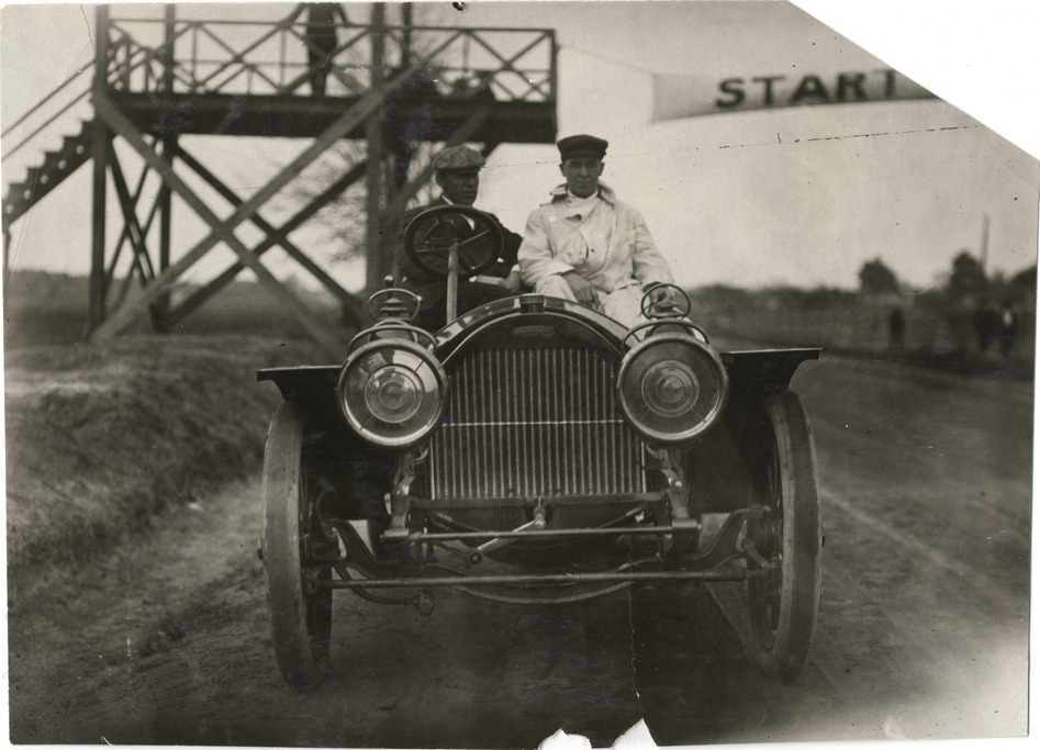 Apperson brothers in Jack Rabbit automobile at starting line, 1908 Grand Prize races