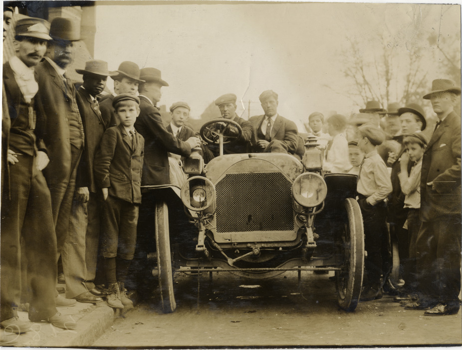 View of crowd surrounding driver and passenger in Studebaker car during the 1908 Grand Prize races in Savannah, Georgia. The Studebaker participated in a race with a Pullman automobile from Philadelphia to Savannah. Handwritten on back: "Arrival of the Studebaker car first in the race from Phily [sic] to Savannah defeating the Pullman. Races and racing--Grand Prize races, 1908."