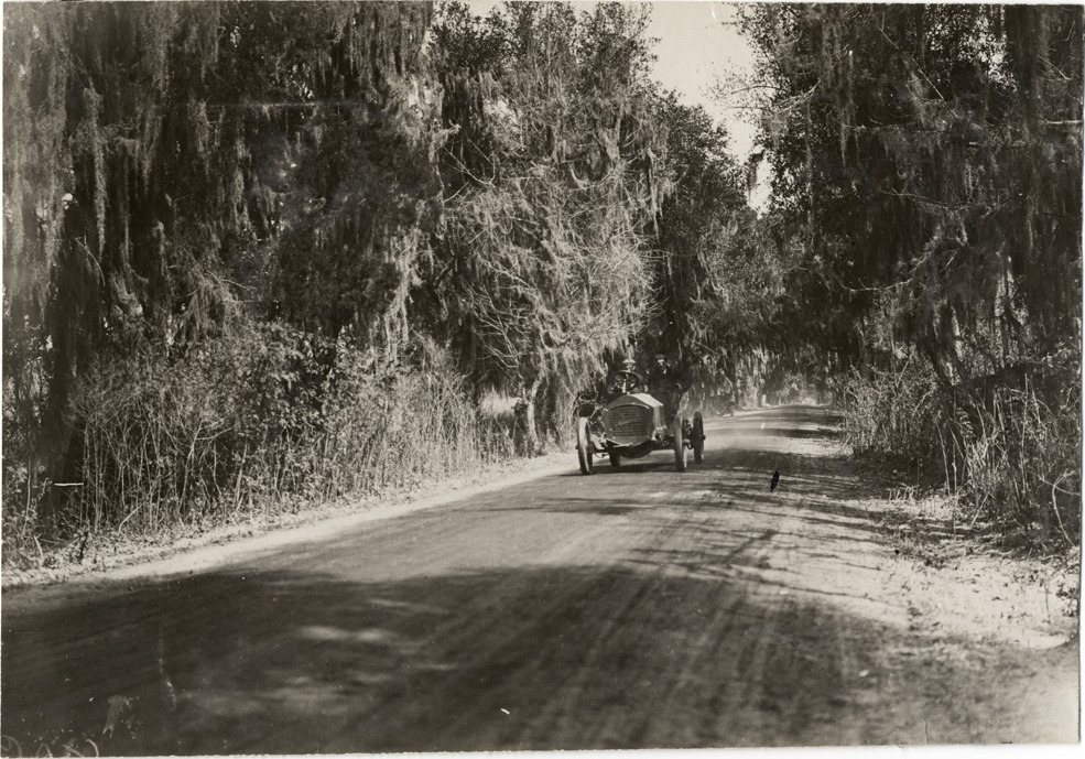 View of driver and passenger racing Acme car on course during the 1908 Grand Prize races in Savannah, Georgia. Handwritten on back: "Acme. Races and racing--Grand Prize races, 1908."