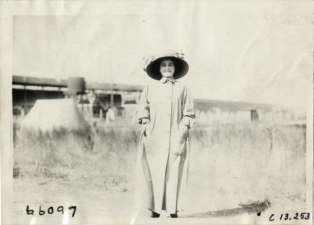 View of a woman, wearing a long coat and wide-brimmed hat, at the 1910 Grand Prize races in Savannah, Georgia. Stamped on back: "Spooner & Wells, Inc., photographers, telephones 3472-3473 Columbus, 1931 Broadway, New York." Handwritten on back: "Races and racing--Grand Prize races, 1910."