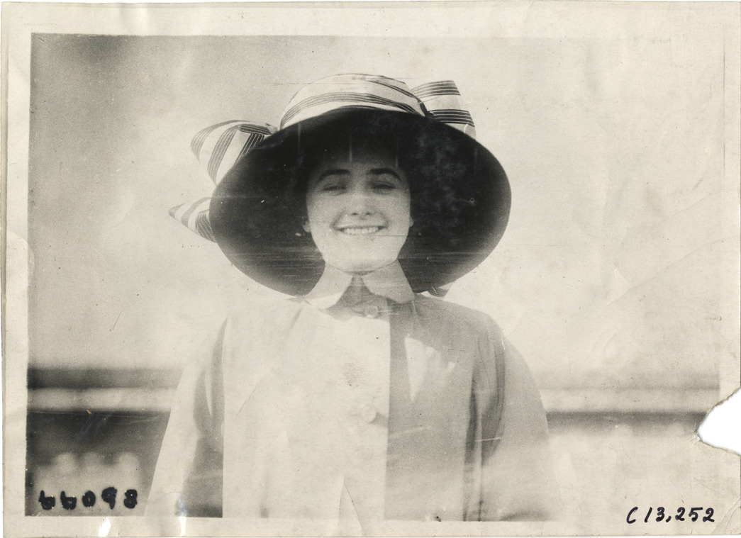 Close-up view of a woman, wearing a wide-brimmed hat, at the 1910 Grand Prize races in Savannah, Georgia. Stamped on back: "Spooner & Wells, Inc., photographers, telephones 3472-3473 Columbus, 1931 Broadway, New York." Handwritten on back: "Races and racing--Grand Prize races, 1910."
