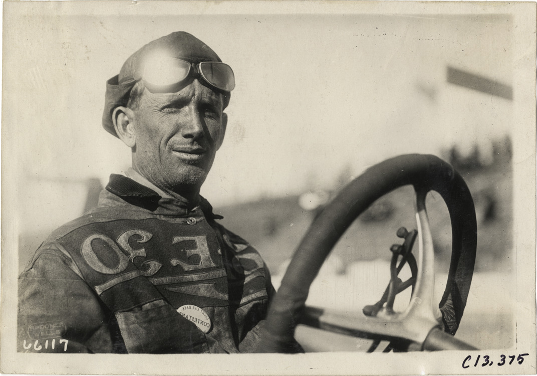 Close-up view of racecar driver during the 1910 Grand Prize races in Savannah, Georgia. Driver wears a "Light Car Race contestant" button. Printed on front: "Spooner, Wells." Stamped on back: "Spooner & Wells, Inc., photographers, telephones 3472-3473 Columbus, 1931 Broadway, New York." Handwritten on back: "Races and racing--Grand Prize races, 1910." Print is reversed.
