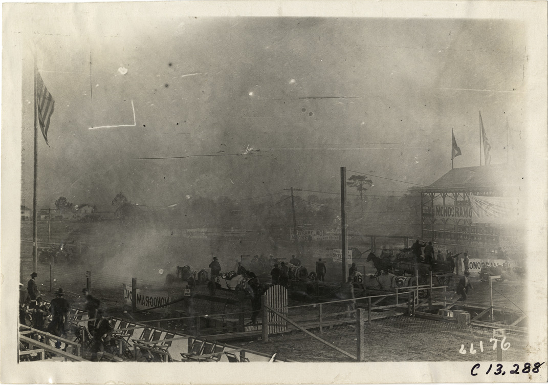 Racecars inside fenced enclosures, 1910 Grand Prize races