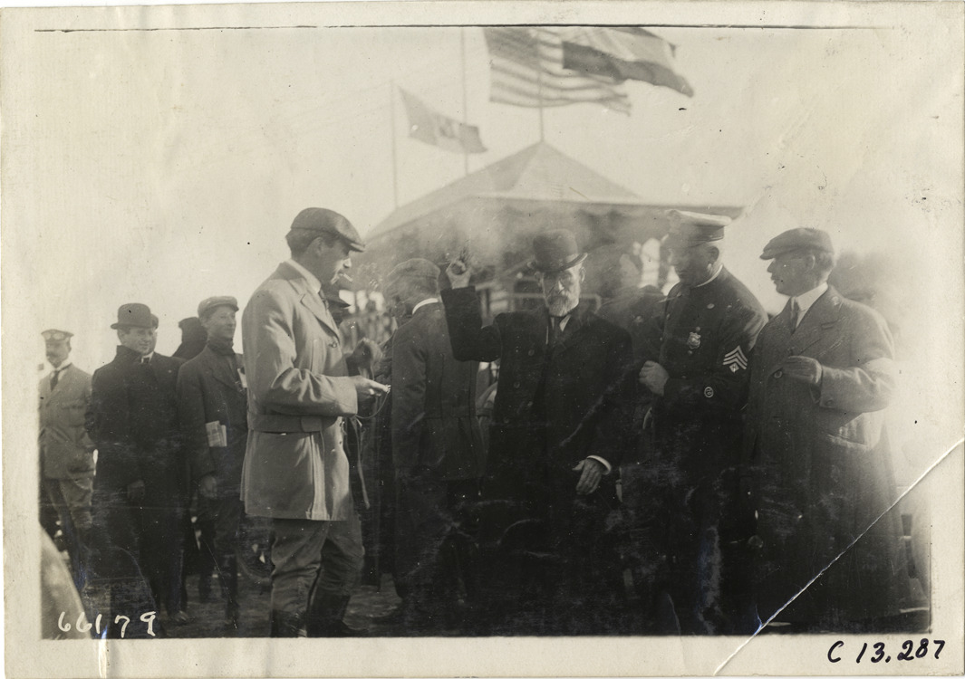 Joseph M. Brown with policeman and officials, 1910 Grand Prize races