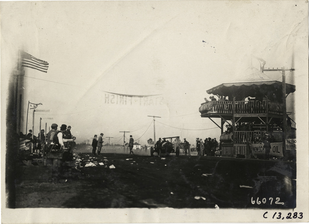 Racecar under "Start-Finish" banner, 1910 Grand Prize races