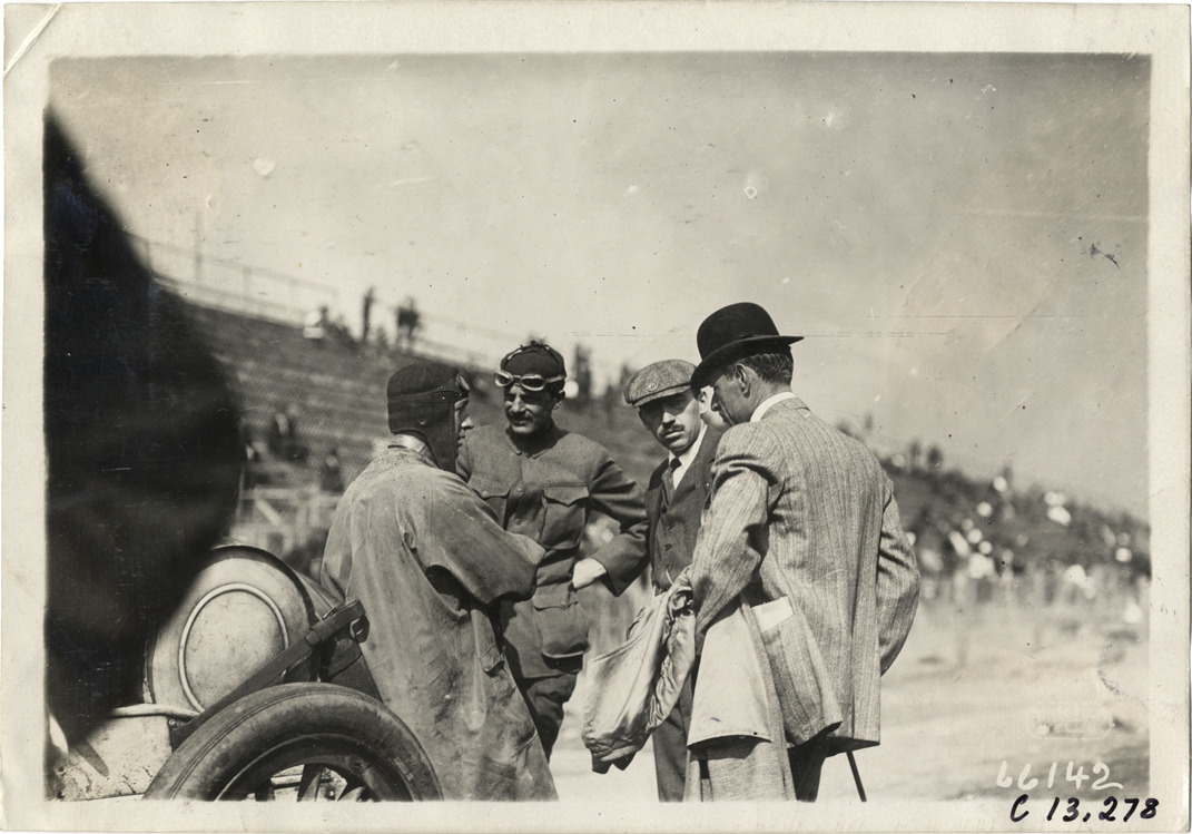Officials speaking with drivers, 1910 Grand Prize races