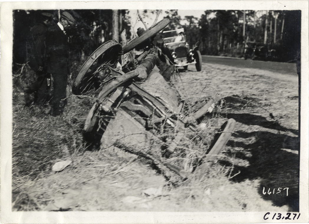 View of two men looking at overturned racecar on roadside during the 1910 Grand Prize races in Savannah, Georgia. Car in background. Stamped on back: "Spooner & Wells, Inc., photographers, telephones 3472-3473 Columbus, 1931 Broadway, New York." Handwritten on back: "Races and racing--Grand Prize races, 1910."