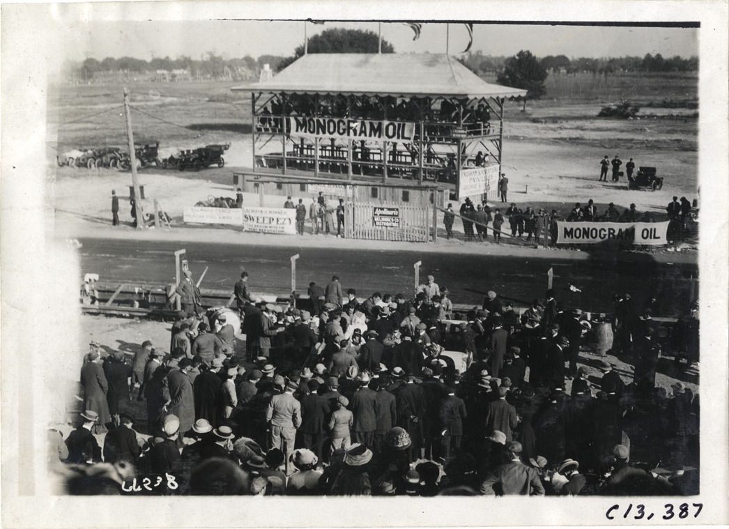 View of press box with "Monogram oil" banner during the 1910 Grand Prize races in Savannah, Georgia. Group of spectators in foreground. Printed on front: "Spooner, Wells." Stamped on back: "Spooner & Wells, Inc., photographers, telephones 3472-3473 Columbus, 1931 Broadway, New York." Handwritten on back: "Races and racing--Grand Prize races, 1910."
