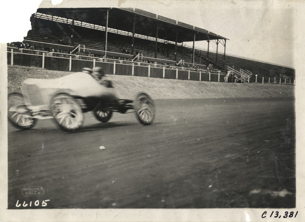 View of racecar passing empty grandstand and bleachers during the 1910 Grand Prize races in Savannah, Georgia. Printed on front: "Spooner, Wells." Stamped on back: "Spooner & Wells, Inc., photographers, telephones 3472-3473 Columbus, 1931 Broadway, New York." Handwritten on back: "Races and racing--Grand Prize races, 1910."