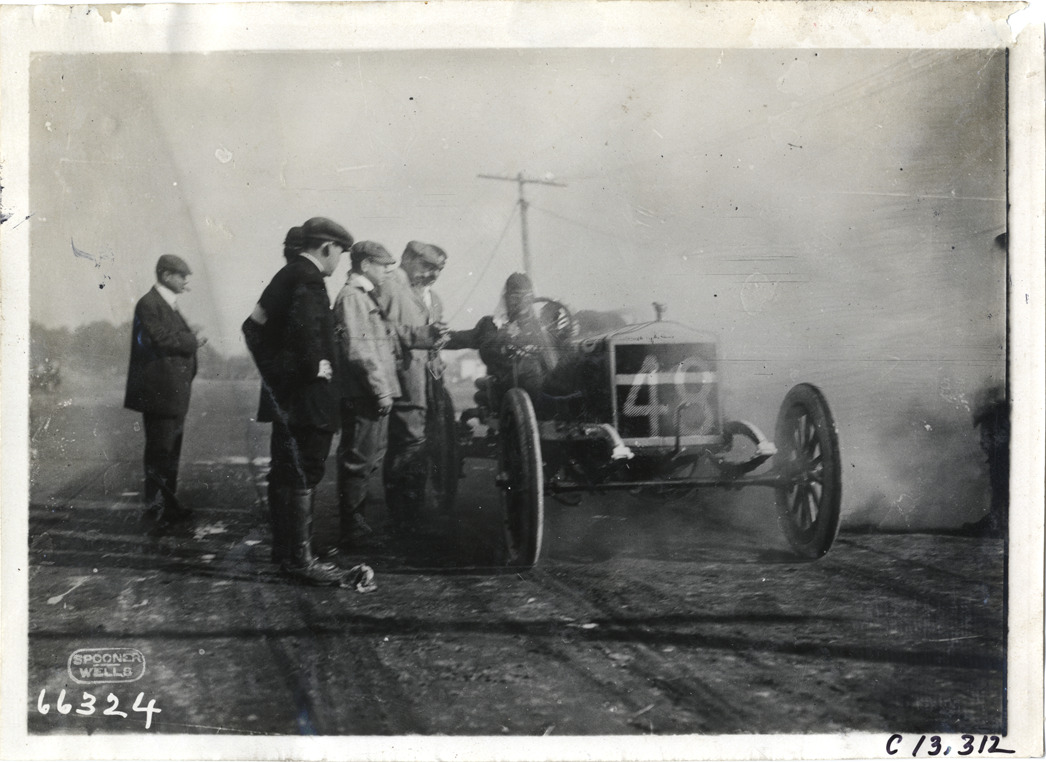 View of several racing officials standing next to driver in car no. 48 during the 1910 Grand Prize races in Savannah, Georgia. Printed on front: "Spooner, Wells." Stamped on back: "Spooner & Wells, Inc., photographers, telephones 3472-3473 Columbus, 1931 Broadway, New York." Handwritten on back: "Races and racing--Grand Prize races, 1910."