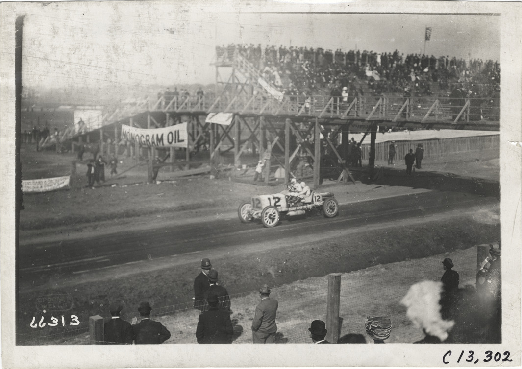 View of driver and passenger racing car no. 12 past grandstand during the 1910 Grand Prize races in Savannah, Georgia. Spectators walk across pedestrian bridge over road; "Monogram oil" banner displayed on bridge. Printed on front: "Spooner, Wells." Stamped on back: "Spooner & Wells, Inc., photographers, telephones 3472-3473 Columbus, 1931 Broadway, New York." Handwritten on back: "Races and racing--Grand Prize races, 1910."