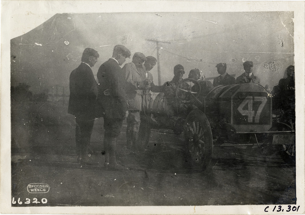 View of several racing officials standing next to driver and passenger in car no. 47 during the 1910 Grand Prize races in Savannah, Georgia. Printed on front: "Spooner, Wells." Stamped on back: "Spooner & Wells, Inc., photographers, telephones 3472-3473 Columbus, 1931 Broadway, New York." Handwritten on back: "Races and racing--Grand Prize races, 1910."