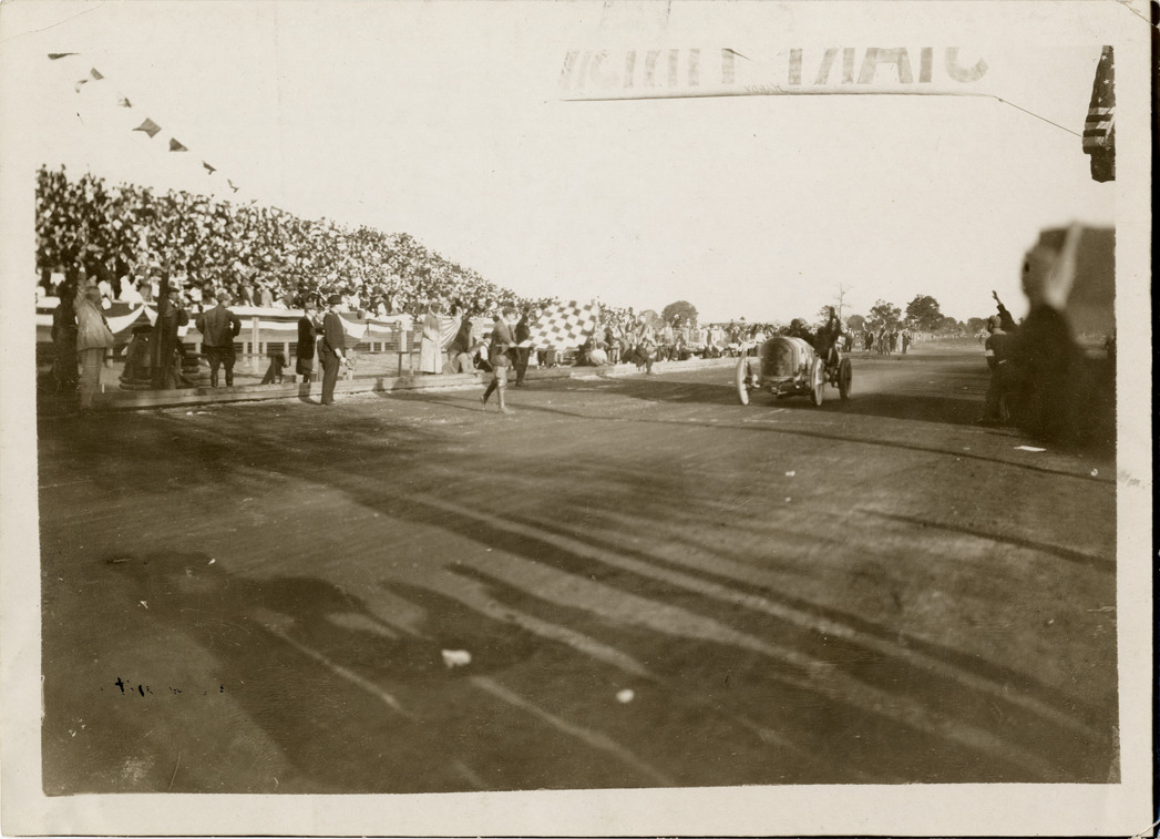 Victor Hemery and passenger in Benz racecar crossing finish line, 1910 Grand Prize races