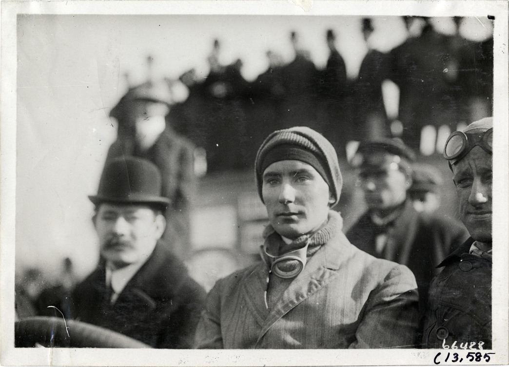 Close-up view of driver in racecar during the 1910 Guttenberg races in Guttenberg, New Jersey. Stamped on back: "Spooner & Wells, Inc., photographers, telephones 3472-3473 Columbus, 1931 Broadway, New York." Handwritten on back: "Races and racing--Guttenberg races, 1910."