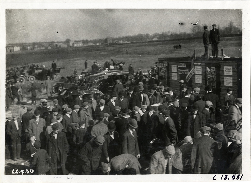 View of crowd of men surrounding racecar during the 1910 Guttenberg races in Guttenberg, New Jersey. Handbills are affixed to wooden-frame shed in background; two men stand on shed roof. Stamped on back: "Spooner & Wells, Inc., photographers, telephones 3472-3473 Columbus, 1931 Broadway, New York." Handwritten on back: "Races and racing--Guttenberg races, 1910."