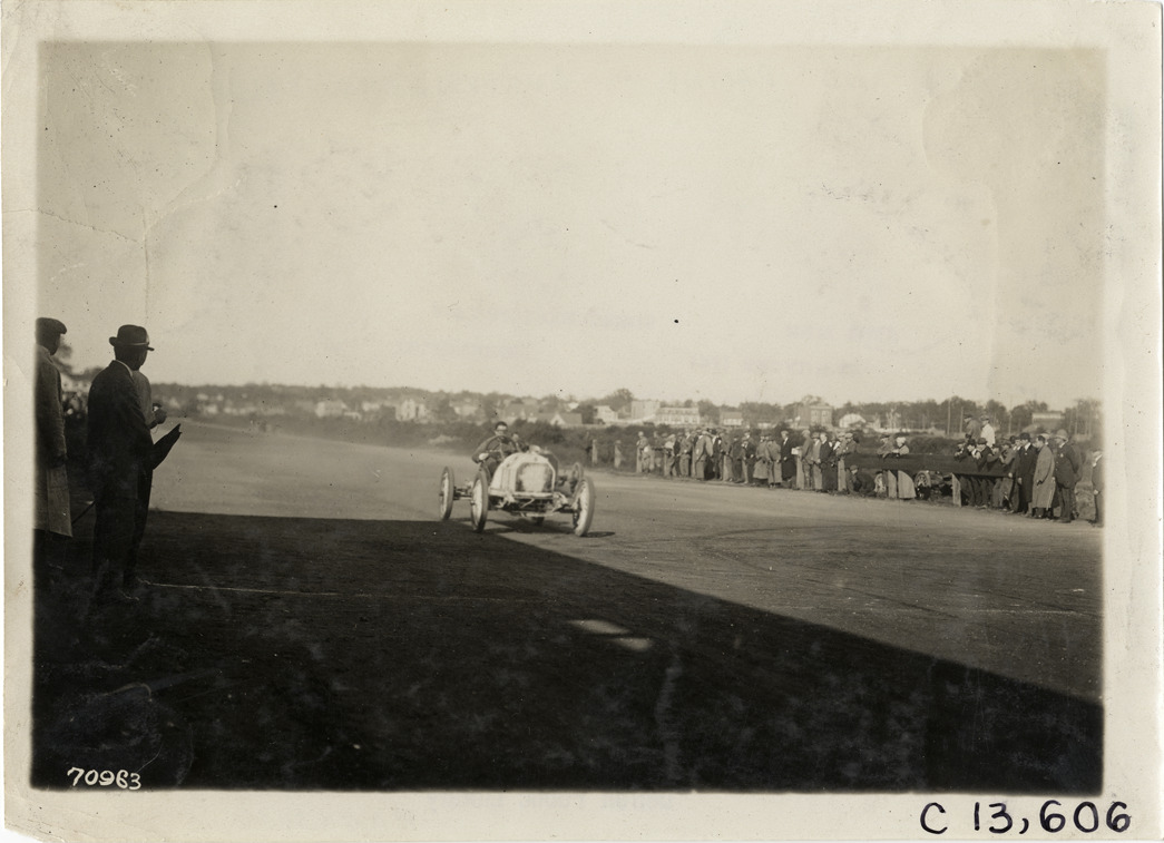 View of driver racing car on track during the 1911 Guttenberg races in Guttenberg, New Jersey. Spectators watch from sidelines. Stamped on back: "Spooner & Wells, Inc., photographers, telephones 3472-3473 Columbus, 1931 Broadway, New York." Handwritten on back: "Races and racing--Guttenberg races, 1911."
