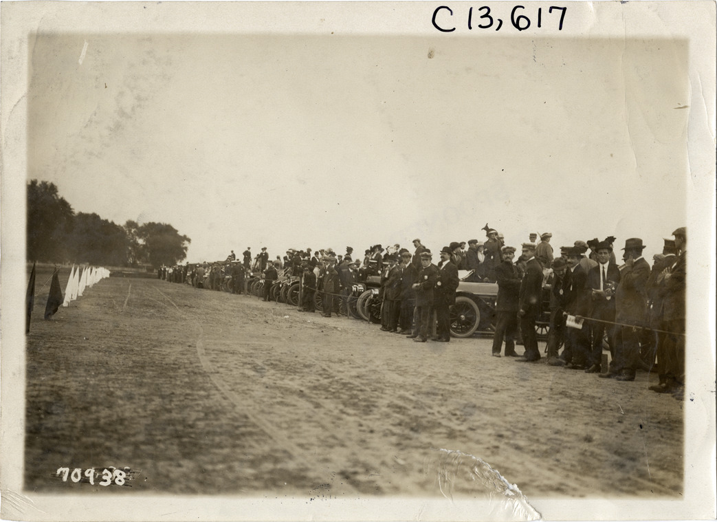View of spectators, some with their cars, on roadside during the 1911 Guttenberg races in Guttenberg, New Jersey. Stamped on back: "Spooner & Wells, Inc., photographers, telephones 3472-3473 Columbus, 1931 Broadway, New York." Handwritten on back: "Races and racing--Guttenberg races, 1911."