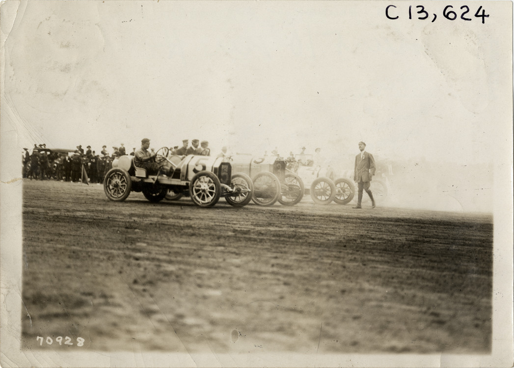 Racecars waiting at starting line for ten mile automobile race, 1911 Guttenberg races