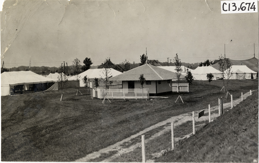 View of wooden-frame building with hipped roof surrounded by tents during the 1909 races at the Indianapolis Speedway in Indiana. Building is encircled with picket fence. Stamped on back: "Photo by Spooner & Wells, Inc. 1931 Broadway, N.Y." Handwritten on back: "Races and racing--Indianapolis races, 1909."