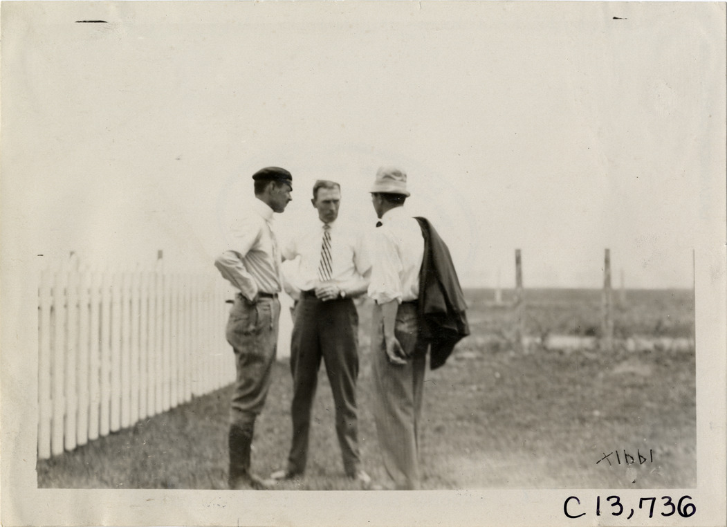 View of three men standing next to fence during the 1910 races at the Indianapolis Speedway in Indiana. Stamped on back: "Spooner & Wells, Inc., photographers, telephone North 1745. 1231 Woodward Ave., Detroit, Mich. Detroit, 1231 Woodward, New York, 1931 Broadway." Handwritten on back: "Races and racing--Indianapolis races, 1910."