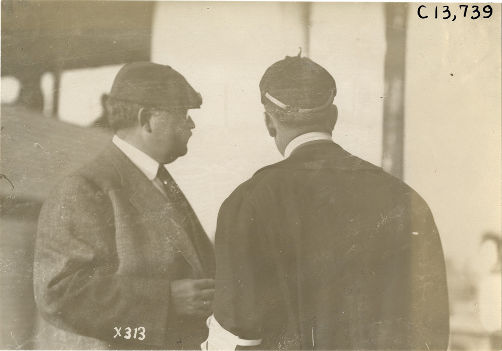 View of Chairman S.M. Butler and E.A. Moross, manager of the Indianapolis Speedway, during the 1910 races at the Indianapolis Speedway in Indiana. Handwritten on back: "Chairman Butler & Mgr. Moross. Races and racing--Indianapolis races, 1910."