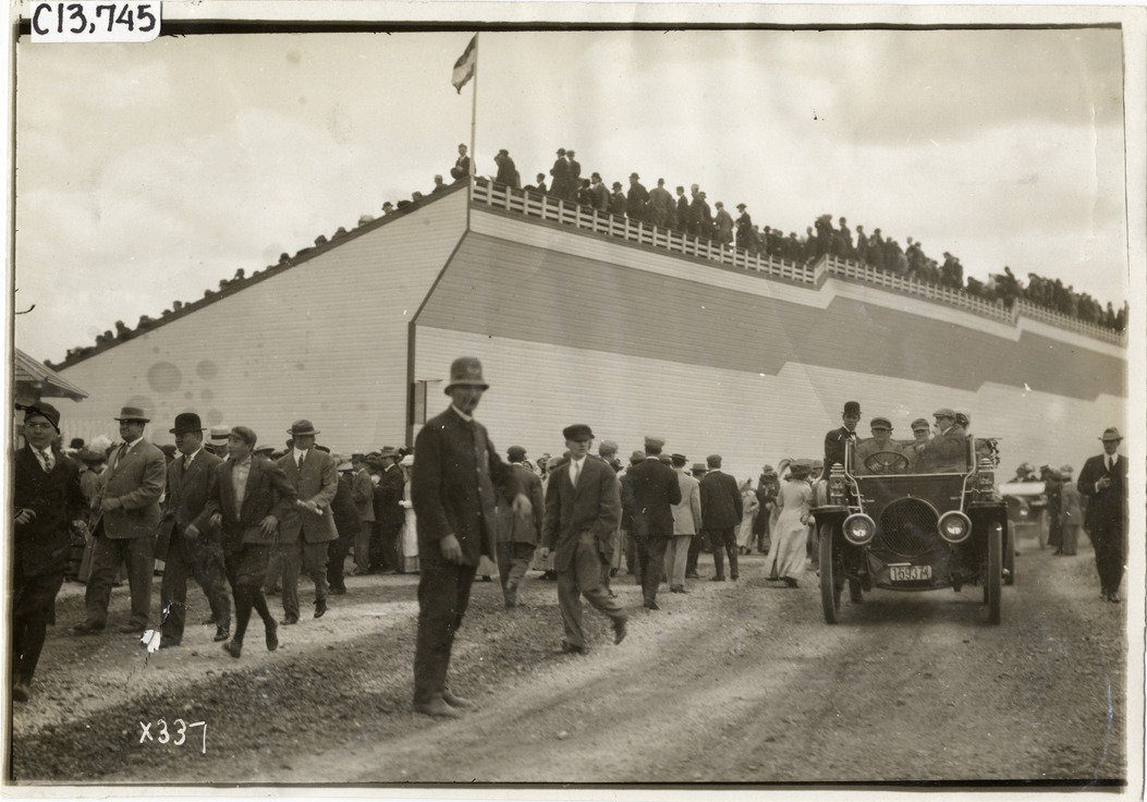 View of policeman standing behind grandstand during the 1910 races at the Indianapolis Speedway in Indiana. Spectators walk behind grandstand; motorists in car on right. Stamped on back: "Spooner & Wells, Inc., photographers, telephone North 1745. 1231 Woodward Ave., Detroit, Mich. Detroit, 1231 Woodward, New York, 1931 Broadway." Handwritten on back: "Races and racing--Indianapolis races, 1910."