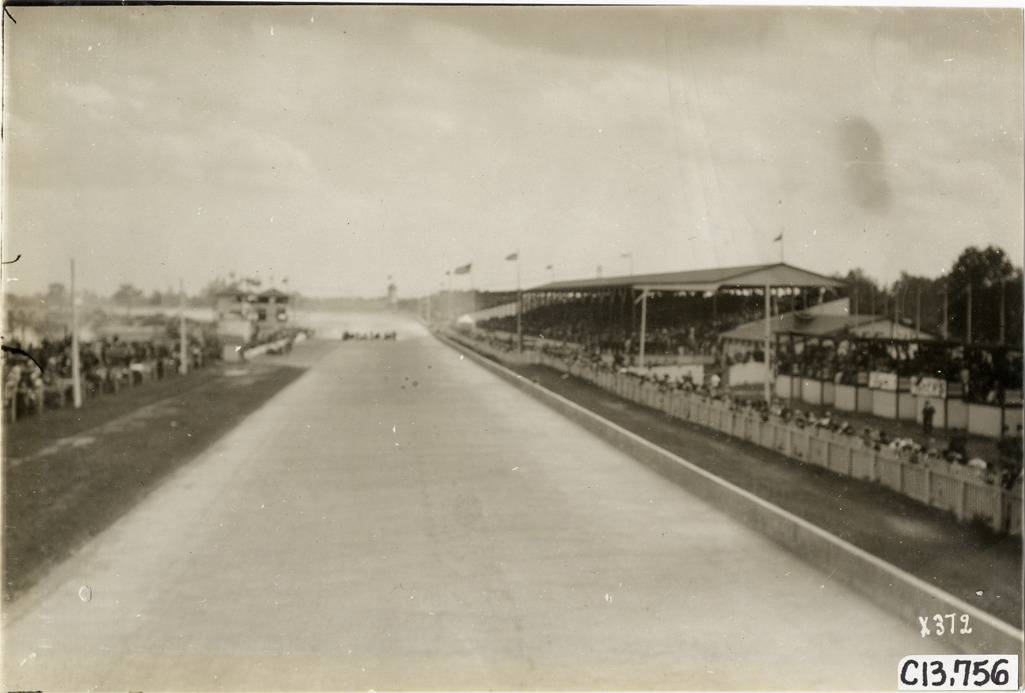 Distant view of cars at starting line during the 1910 races at the Indianapolis Speedway in Indiana. Grandstand on right. Handwritten on back: "From bridge crossing [undecipherable]. Races and racing--Indianapolis races, 1910."