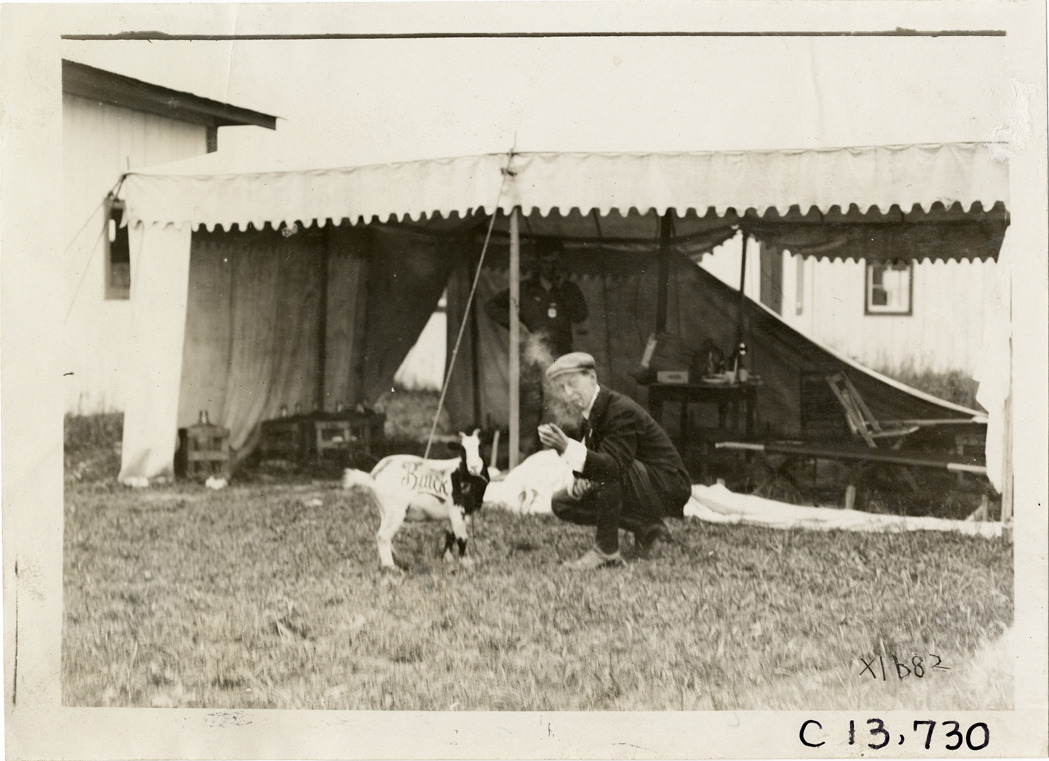 View of Dr. Wadsworth Warren and Buick goat mascot during the 1910 races at the Indianapolis Speedway in Indiana. Stamped on back: "Spooner & Wells, Inc., photographers, telephone North 1745. 1231 Woodward Ave., Detroit, Mich. Detroit, 1231 Woodward, New York, 1931 Broadway." Handwritten on back: "Dr. Wadsworth, goat mascot. Races and racing--Indianapolis races, 1910."